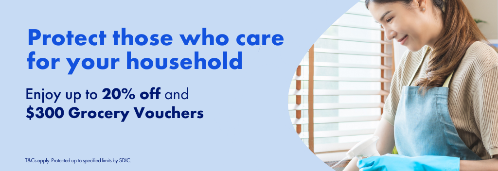 Limited time only! Enjoy 20% and get up to S$300 worth of vouchers when you purchase AIG Domestic Helper Insurance now.
